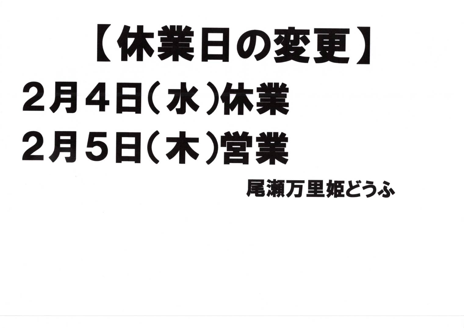 2月休業日変更のお知らせ